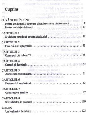 Dupa multe veacuri in care viata casniciilor crestine s-a scurs fara schimbare in fagasul unor traditii mai mult nescrise, modernitatea a pus Bise¬rica in fata unor extraordinare presiuni asupra vietii de familie. Cei ce doresc sa ramana credinciosi ortodoxiei se confrunta cu o multime de nedumeriri legate de conflictul dintre valorile crestine traditionale si practicile lumii secularizate in care traiesc. Cartea de fata, scrisa de un preot ortodox american intr-un limbaj accesibil si atragator, ofera o perspectiva completa si coerenta, intemeiata pe marturiile Sfintilor Parinti si altor teologi de seama, asupra semnificatiei casniciei ortodoxe si a problemelor pe care le au de rezolvat in vremea noastra cei ce urmeaza calea mantuirii prin viata de familie.