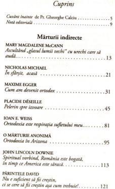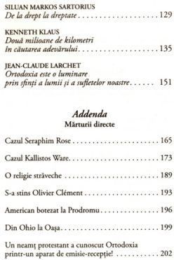Marturiile directe n-au fost retinute aici pe criterii de importanta sau de notorietate, ci au incercat sa acopere ipostaze diferite ale umanului (o actrita mama a doi copii, un fost muzician declasat, un intelectual cu renume jurnalistic, un preot-monah romano-catolic, un crestin ortodox de origine evreiasca etc.). In Addenda am asezat alte cateva texte de egala relevanta, dar care nu constituie marturisiri directe, ci evocari ucenicesti sau jurnalistice. Printre ele se numara si una arhiereasca (I.P.S. Teofan Savu despre teologul ortodox francez Olivier Clément, la moartea acestuia).