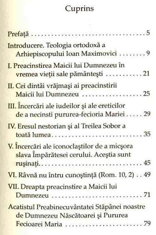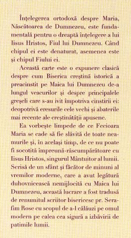 Ea vorbeşte limpede de ce Fecioara Maria se cade să fie slăvită de toate neamurile şi, în acelaşi timp, de ce nu poate fi socotită împreună-răscumpărătoare cu Iisus Hristos, singurul Mântuitor al lumii. Scrisă de un sfânt şi făcător de minuni al vremilor moderne, care a avut legătură duhovnicească nemijlocită cu Maica lui Dumnezeu, această lucrare a fost tradusă de renumitul scriitor bisericesc pr. Serafim Rose cu scopul de a-l călăuzi pe omul modern pe calea cea sigură a izbăvirii de patimile lumii