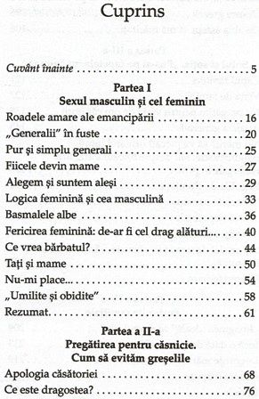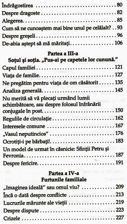 În această lucrare extrem de accesibilă fiecare cititor – indiferent dacă este proaspăt căsătorit, familist „cu stagiu” sau doar în pragul întemeierii unei familii – va găsi cunoştinţele preţioase care pot face diferenţa între o căsnicie armonioasă şi una afectată de permanente fricţiuni şi zbuciumuri.