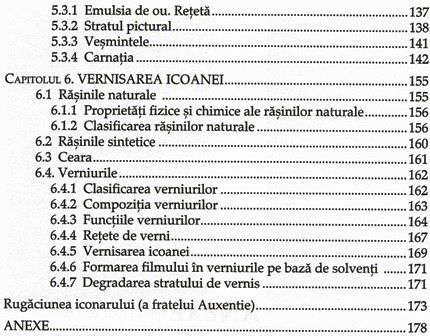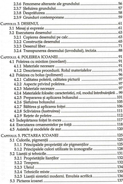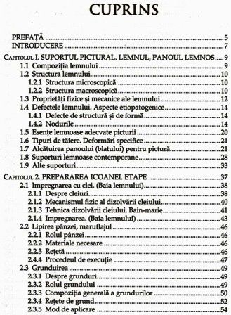 Capitolele lucrării constituie dezvoltarea fiecărei etape a pictării unei icoane bizantine, de la alegerea lemnului până la vernisare. Nu am urmărit neapărat prezentarea exhaustivă a tuturor tehnicilor și materialelor posibile, ci am încercat să focalizez expunerea în primul rând pe variantele tradiționale, considerate în mod firesc drept cele mai importante, și în al doilea rând pe câteva dintre cele mai frecvent utilizate materiale contemporane. La sfârșitul lucrării găsim icoane ale unora dintre cei mai talentați pictori din țara noastră și din Grecia, cei care vor duce mai departe inestimabilul tezaur vizual al Ortodoxiei