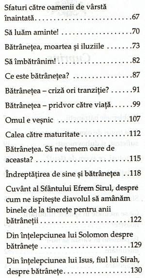 Bătrânețea nu e doar o vreme oarecare din viața pământească a omului, ci o perioadă a existenței omenești dăruită de Dumnezeu pentru adunarea roadelor vieții, răgazul menit cugetării și meditării asupra celor trăite. Bătrânețea e timpul în care nu doar cei în vârstă, ci și cei din jur se cade să cugete cu luare-aminte asupra sufletului.