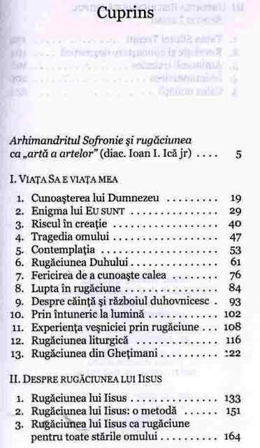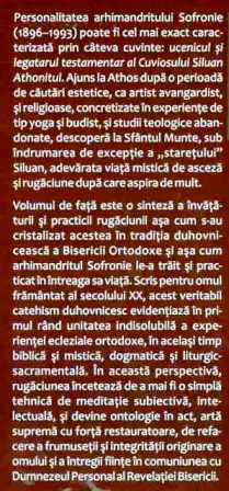 Volumul de fata este o sinteza a invataturii si practicii rugaciunii asa cum s-au cristalizat acestea in traditia duhovniceasca a Bisericii Ortodoxe si asa cum arhimandritul Sofronie le-a trait si practicat in intreaga sa viata. Scris pentru omul framantat al secolului XX, acest veritabil catehism duhovnicesc evidentiaza in primul rand unitatea indisolubila a experientei ecleziale ortodoxe, in acelasi timp biblica si mistica, dogmatica si liturgic-sacramentala. In aceasta perspectiva, rugaciunea inceteaza de a mai fi o simpla tehnica de meditatie subiectiva, intelectuala, si devine ontologie in act, arta suprema cu forta restauratoare, de refacere a frumusetii si integritatii originare a omului si a intregii fiinte in comuniunea cu Dumnezeul Personal al Revelatiei Bisericii.