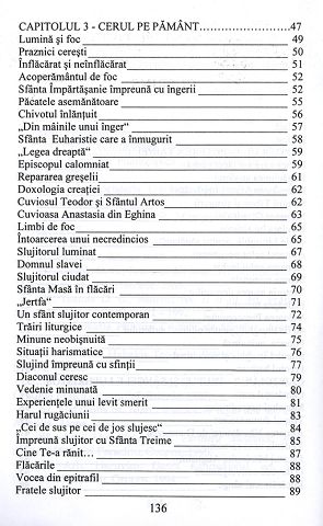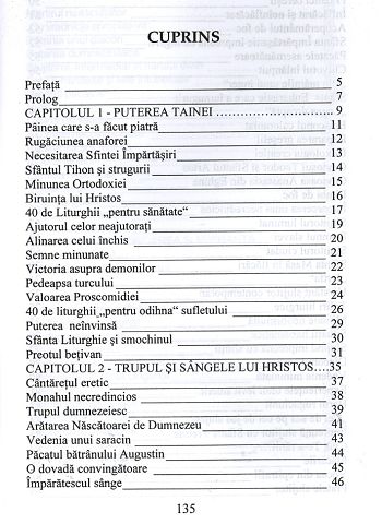 „La fiecare Slujbă a Sfintei Liturghii sunt strânşi, în jurul Sfântului Jertfelnic, Preasfânta Născătoare de Dumnezeu Fecioara Maria, toţi sfinţii, lumea îngerească, fraţii noştri vii şi adormiţi, toată creaţia. Împreună liturghisesc şi slăvesc pe Dumnezeu pentru arătarea Iubirii Lui, lumii. Aşa a trăit sfânta împărtăşire poporul lui Dumnezeu de-a lungul tuturor veacurilor. Aceeaşi realitate trăieşte şi creştinul de azi, în limita credinţei şi înălţimii lui duhovniceşti. Câteodată Dumnezeu dă la o parte cortina care acoperă săvârşirea tainicei Slujbe a Sfintei Liturghii şi atunci marea taină este descoperită. Alteori se observă cum se leagă Sfânta Euharistie cu întâmplări străine şi paradoxale, minuni care cutremură. Cu toate acţiunile vizibile ale Sfintelor Taine, Dumnezeu, prin voia Sa, acţionează şi vindecă boli, salvează din pericole, dă putere celor ce luptă, sprijină pe cei puţin credincioşi, luminează pe cei întunecaţi, controlează pe cei păcătoşi, conduce la Adevărul Bisericii. O mică parte din aceste intervenţii şi descoperiri minunate, care se leagă de Slujba Sfintei Liturghii şi Sfânta Euharistie, va găsi cititorul în următoarele pagini.”