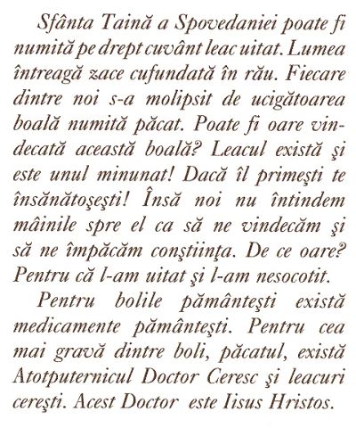 Sfanta Taina a Spovedaniei poate fi numita pe drept cuvant "leac uitat". Lumea intreaga zace cufundata in rau. Fiecare dintre noi s-a molipsit de ucigatoarea boala numita pacat. Poate fi oare vindecata aceasta boala? Leacul exista si este unul minunat! Daca il primesti te insanatosesti! Insa noi nu intindem mainile spre el ca sa ne vindecam si sa ne impacam constiinta. De ce oare? Pentru ca l-am uitat si l-am nesocotit.