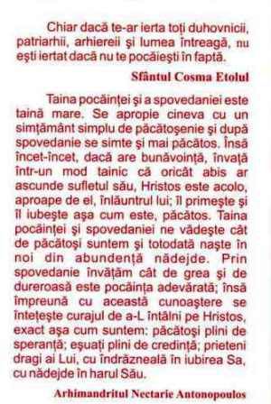 Chiar daca te-ar ierta toti duhovnicii, patriarhii, arhiereii si lumea intreaga, nu esti iertat daca nu te pocaiesti in fapta. Sfantul Cosma Etolul Taina pocaintei si a spovedaniei este taina mare. Se apropie cineva cu un simtamant simplu de pacatosenie si dupa spovedanie se simpte mai pacatos. Insa incet-incet, daca are bunavointa, invata intr-un mod tainic ca oricat abis sr ascunde sufletul sau, Hristos este acolo, aproape de el, inlauntrul lui; il primeste si il iubeste asa cum este, pacatos. Taina pocaintei si spovedanie ne vadeste cat de pacatosi suntem si totodata naste in noi din abundenta nadejde. Prin spovedanie invatam cat de grea si de dureroasa este pocainta adevarata; insa impreuna cu aceasta cunoastere se inteteste curajul de a-L intalni pe Hristos, exact asa cum suntem: pacatosi plini de speranta; esuati plini de credinta; prieteni dragi Lui, cu indrazneala in iubirea Sa, cu nadejdea in harul Sau. Arhimandritul Nectarie Antonopoulos