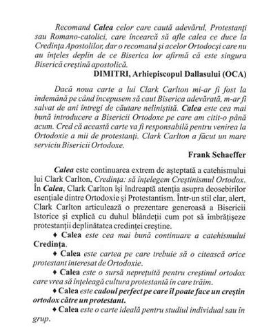 Calea de la Protestantism la Ortodoxie prezintă tulburătoarea confesiune personală a lui profesorului de filozofie Clark Carlton despre frământările itinerariului său spiritual de la erezia baptistă la Credinţa Ortodoxă. Mai mult decât o simplă mărturie a unui convertit, această carte abordează critic Protestantismul, arătând numeroasele devieri ale acestei erezii de la Credinţa Bisericii Apostolice. Deşi s-a desprins de Catolicism pentru a redeveni Biserica Apostolică, Protestantismul s-a îndepărtat chiar mai mult decât Roma de adevărata Biserică a lui Hristos. Clark Carlton demonstrează în această carte că Biserica Ortodoxă este singura şi autentica Biserică Apostolică iar demonstraţia sa se bazează pe Sfânta Scriptură, Sfinţii Părinţi şi experienţa unei vieţi trăite în mijlocul protestanţilor.