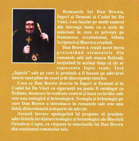 Această lucrare apologetică îşi propune să prezinte adevăratele învăţături teologice şi hristologice ale Bisericii Ortodoxe Copte, ca răspuns la minciunile lui Dan Brown din conţinutul romanelor sale.