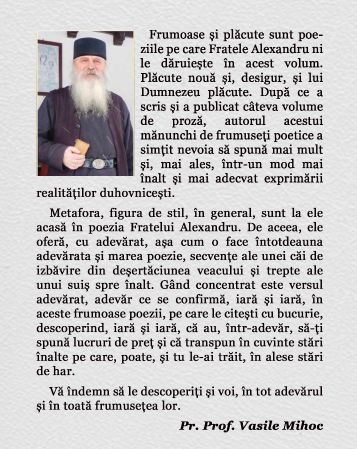 Frumoase și plăcute sunt poeziile pe care Fratele Alexandru ni le dăruiește în acest volum. Plăcute nouă și, desigur, și lui Dumnezeu plăcute. După ce a scris și a publicat câteva volume de proză, autorul acestui mănunchi de frumuseți poetice a simțit nevoia să spună mai mult și, mai ales, într-un mod mai înalt și mai adecvat exprimării realităților duhovnicești.
