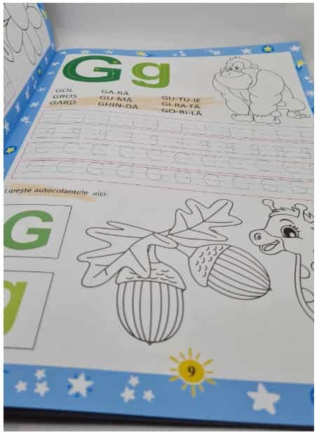Designul atractiv și activitățile din prezența carte au fost gândite special pentru că cei mici să învețe cu ușurință și bucurie literele alfabetului prin mai multe metode scriere, silabisire, citire, colorare și lipire de autocolante.